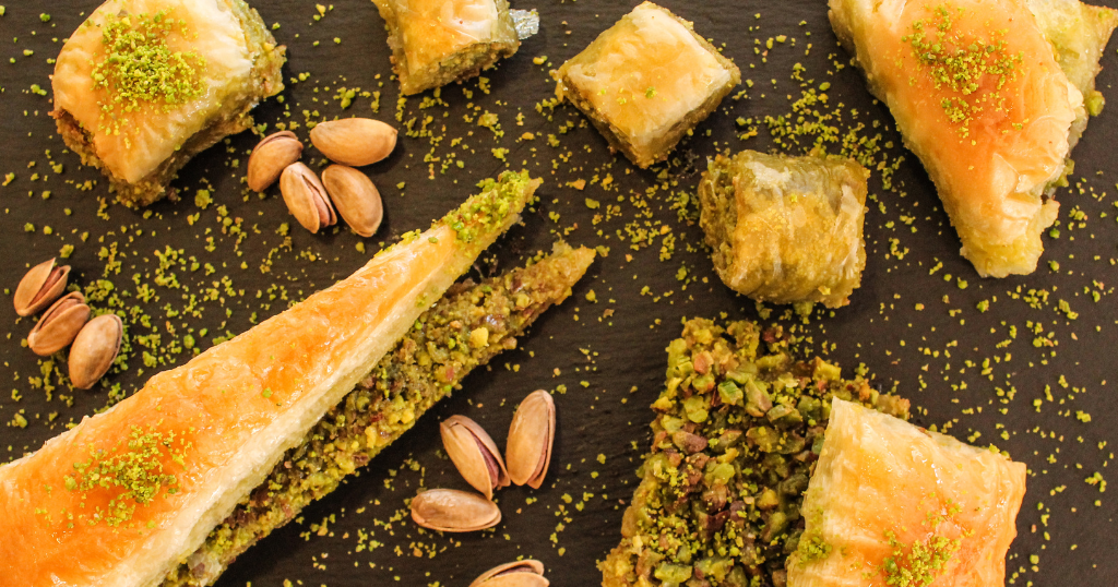 Pistachio baklava is a classic Mediterranean and Middle Eastern dessert made with layers of buttery, flaky phyllo dough and filled with a rich mixture of chopped pistachios, all soaked in a fragrant honey syrup.